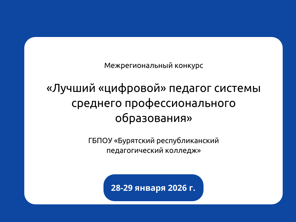 ГБПОУ «Бурятский республиканский педагогический колледж» приглашает принять участие в Межрегиональном конкурсе «Лучший цифровой педагог системы среднего профессионального образования» преподавателей и мастеров производственного обучения профессиональных образовательных организаций России и дружественных стран.