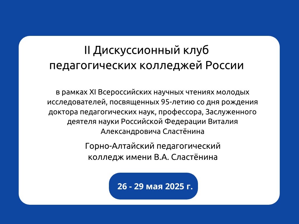 Организационный комитет в лице Министерства образования и науки Республики Алтай, БПОУ Республики Алтай «Горно-Алтайский педагогический колледж имени В.А. Сластёнина» приглашает представителей профессионального педагогического образования регионов принять участие во II Дискуссионном клубе педагогических колледжей России в рамках XI Всероссийских научных чтениях молодых исследователей, посвященных 95-летию со дня рождения доктора педагогических наук, профессора, Заслуженного деятеля науки Российской Федерации Виталия Александровича Сластёнина с 26 по 29 мая 2025 г.