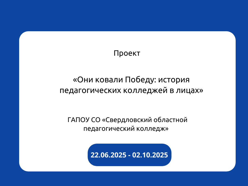 В рамках Года защитника Отечества, празднования 80-летия Победы в Великой Отечественной войне 1941-1945 годов и 85-летия системы среднего профессионального образования Свердловский областной педагогический колледж реализует проект «Они ковали Победу: история педагогических колледжей в лицах». Проект направлен на исследования о преподавателях или выпускниках педагогических колледжей, участниках Великой Отечественной войны и тружениках тыла.