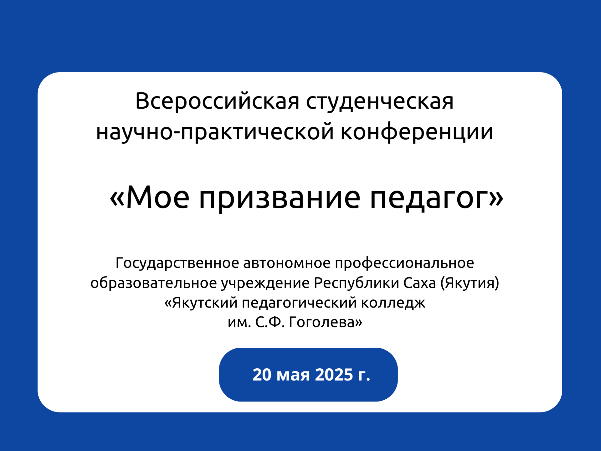 Администрация Государственного автономного профессионального образовательного учреждения Республики Саха (Якутия) «Якутский педагогический колледж им. С.Ф. Гоголева» приглашает Вас принять участие в работе Всероссийской студенческой научно-практической конференции «Мое призвание педагог», в рамках реализации ФП «Профессионалитет» по отрасли «Педагогика» для обучающихся по УГПС 44.00.00 Образование и педагогические науки, 49.00.00 Физическая культура и спорт, 53.02.01 Музыкальное образование, которое состоится 20 мая 2025 года.