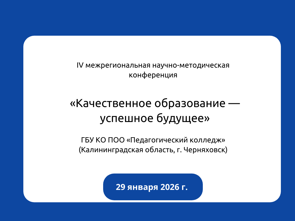 ГБУ КО ПОО «Педагогический колледж» при поддержке Ассоциации учреждений и организаций профессионального образования Калининградской области приглашает руководителей, педагогов, методистов и всех заинтересованных специалистов принять участие в IV Межрегиональной научно-методической конференции «Качественное образование — успешное будущее» (с международным участием).