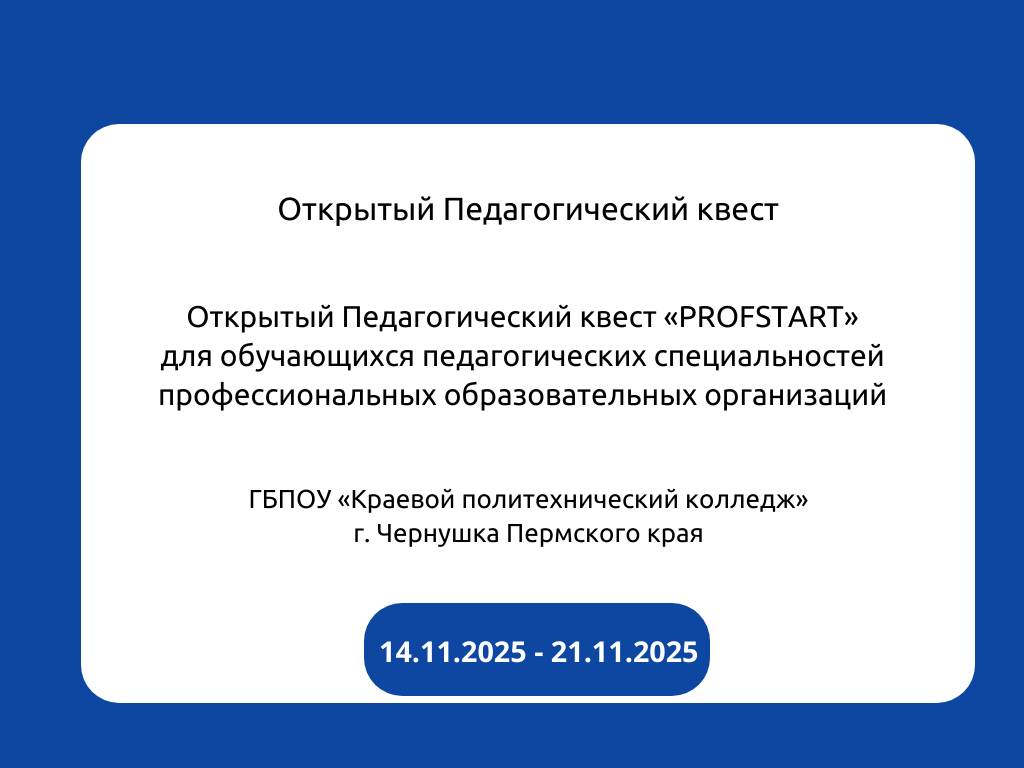 Государственное бюджетное профессиональное образовательное учреждение «Краевой политехнический колледж» (Пермский край, г. Чернушка) приглашает студентов и преподавателей принять участие в открытом Педагогическом квесте «PROFSTART»!