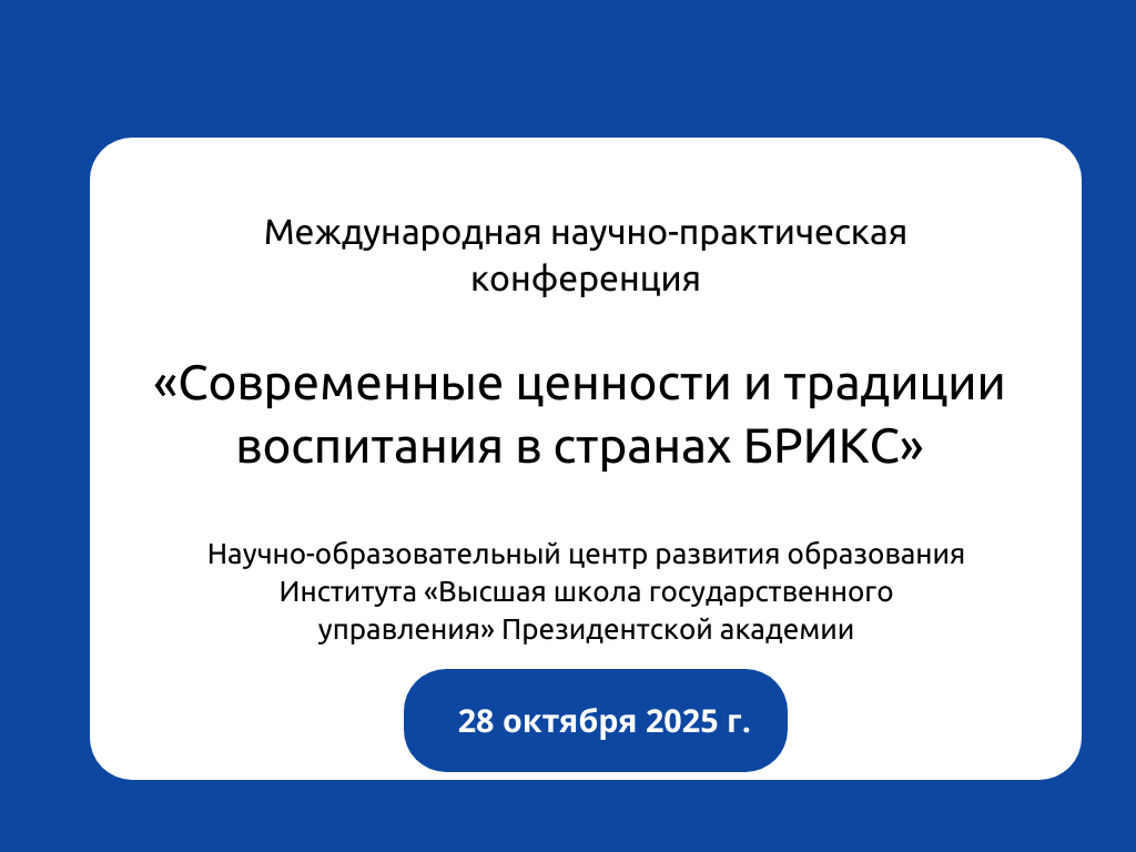 Приглашаем вас принять участие в Международной научно-практической конференции «Современные ценности и традиции воспитания в странах БРИКС», которая состоится 28 октября 2025 года с 10:00 до 16:00 по московскому времени.